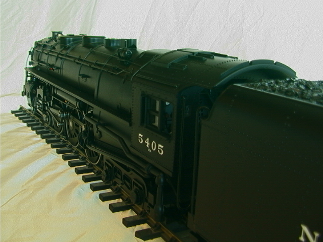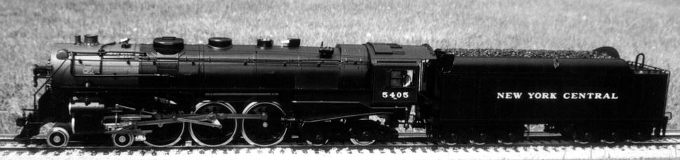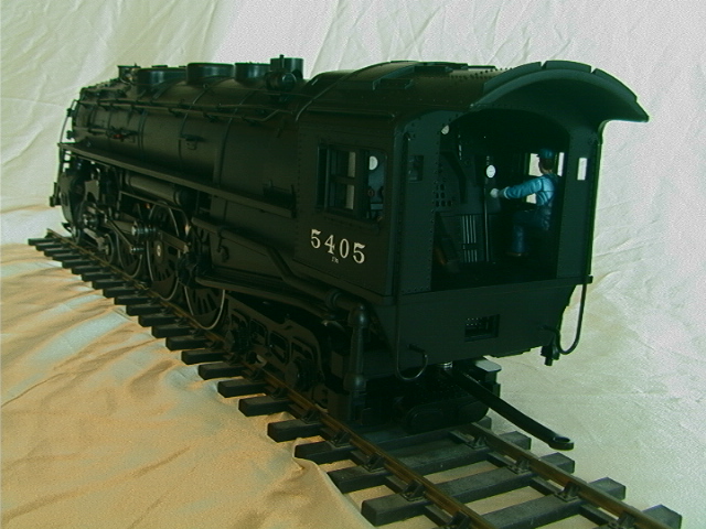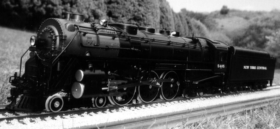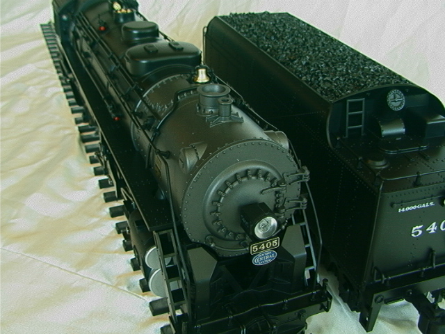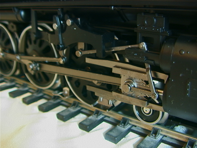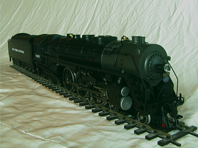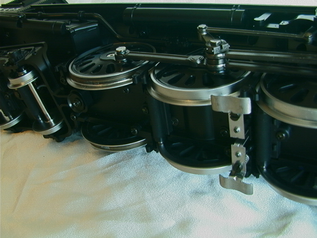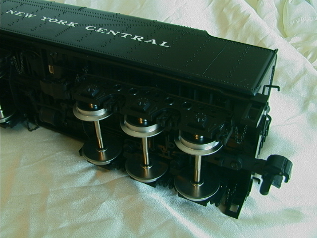 First impressions. It is large (as expected), it is heavy for a plastic model but it does alltogether feel sturdy and it can easily be lifted using the inside of the cab roof and either the inside of the smokebox or the pilot. The model is detailed but not super-detailed, the "Rivarossi for gauge-1" description seems valid. The coupler between loco and tender has only one setting as supplied and this is at far too great a pitch (this must be to allow it to go round the ridiculously tight #2 radius curves, which is fine in itself, but that there is only the one factory setting is really feeble). The stainless tyres on the driver and leading truck look fine given that the boxpok and disk wheels are black but the wheels on the trailing truck and on the tender have not been covered in the same way and you get the full benefit of the shine of the stainless, some black paint provides a simple improvement. The flange depth (3mm) is not finescale but neither is it ridiculous. The smokebox door opens to give access to potentiometers adjusting the volume of sound and smoke. The interior of the funnel is visibly choked down, possibly this is to aid the smoke unit. Other than the smokebox and detail items the main finish is a satin black which will probably suit most owners, it could of course be weathered down if required. Finally we mention what most other commentators have regarded as the prime gripe with the model; the power pick up shoes. Put simply these pick ups do not look good and despite their effectiveness they will, for some people, destroy the otherwise good lines of the model. Perhaps it is time to share a little secret; this model is also rigged to pick up from two of the driving axles and the trailing truck and it does not actually need the shoes to operate, so if you wish these can be removed. Having read this you may wonder why the locomotive has been fitted with shoes in the first place. The most likely answer seems to be that due to the scraping action they may help clean and therefore provide further reliability for outdoor (possibly brass) track such as is used by LGB. In the case of traditional LGB locomotives it must be remembered that there may be only two supporting axles and, with their smaller sizes and lower weights, traction tyres are a needed, which in turn means that pick up shoes are a necessary evil. In the case of the Hudson there are already four axles rigged for pick up and it would not take a total genius to add wiper contacts on to the tender trucks which would give ten axles. We really do feel that this small modification, together with the use of a commercial or home-built track cleaning car, would provide a reliable and aesthetically acceptable solution. Incidentally the rear drivers are fitted with traction tyres, as if the model's weight did not give enough adhesion.
