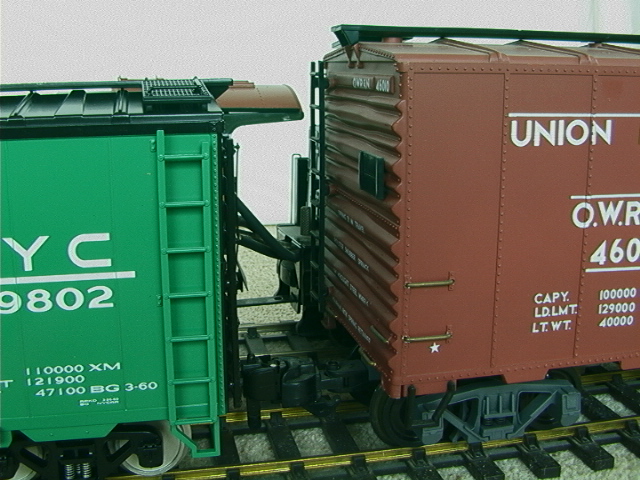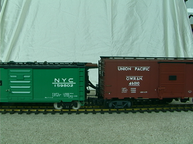If your experience of american outline rolling stock has been the 1:29 scale Aristocraft or USA Trains models then you may find these images instructive (quick comparative dimensions of the MTH model boxcar gives a height of 142mm, rail to walkway and a width of 91mm versus 160mm and 105mm for the Aristocraft model). A final word if you do intend to mix scales, I would suggest that you put one or more items of rolling stock that do not reach full height (gondolas or a tank car for instance) between boxcars to help make the jump in height and width less obvious.