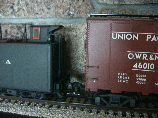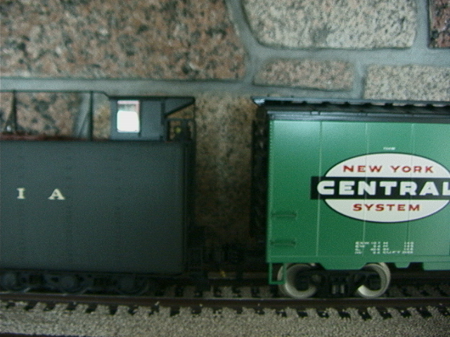 1/32 scale M1a (now that is a decent finescale model) with an MTH boxcar, compare height of boxcar walkway with doghouse cupola on tender. To my eyes this does not look too stupid for height or width.